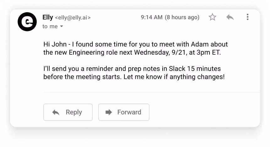 Loop in Elly to automatically coordinate new calls, send availability to candidates, and align your team’s calendars.