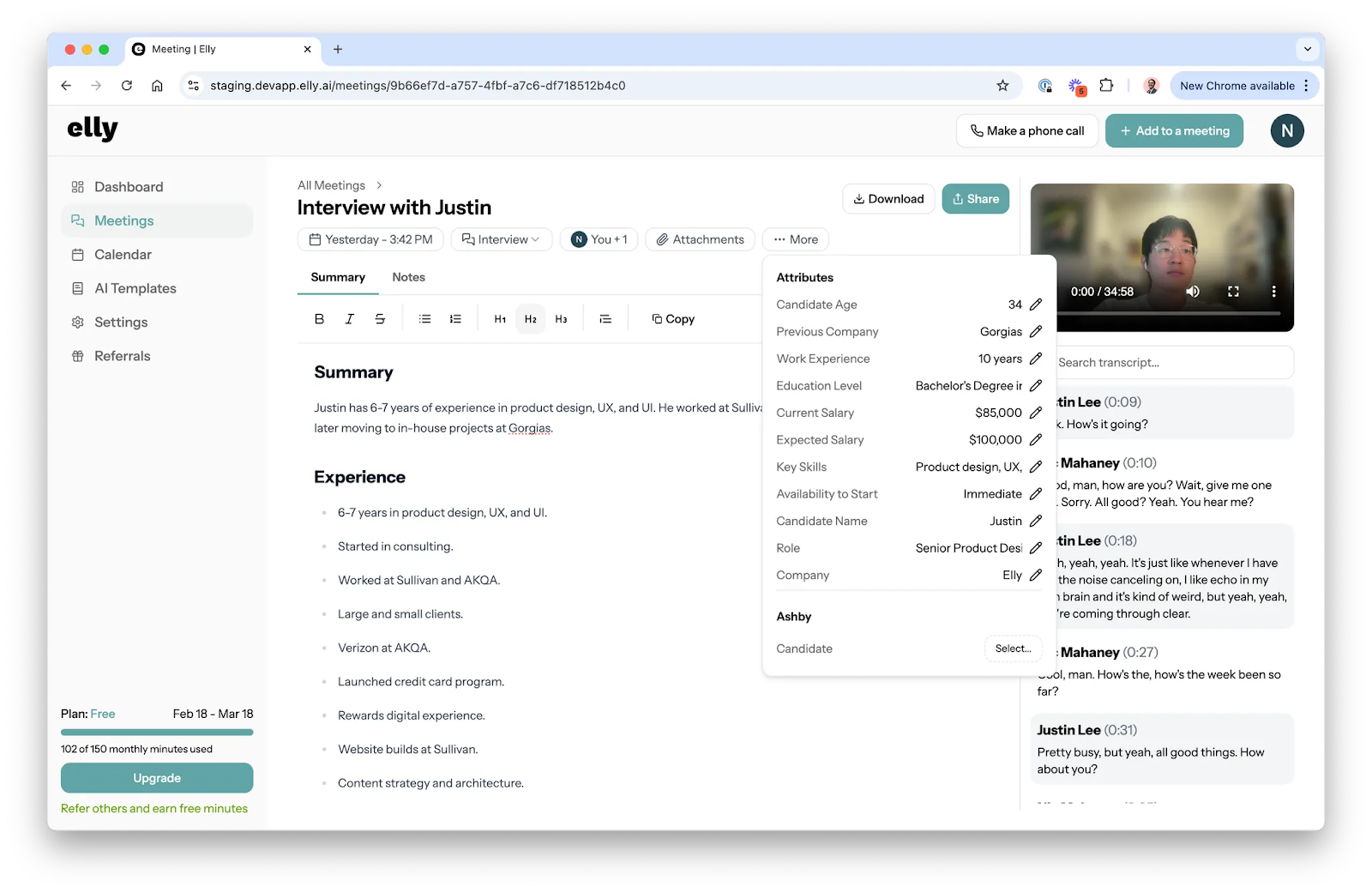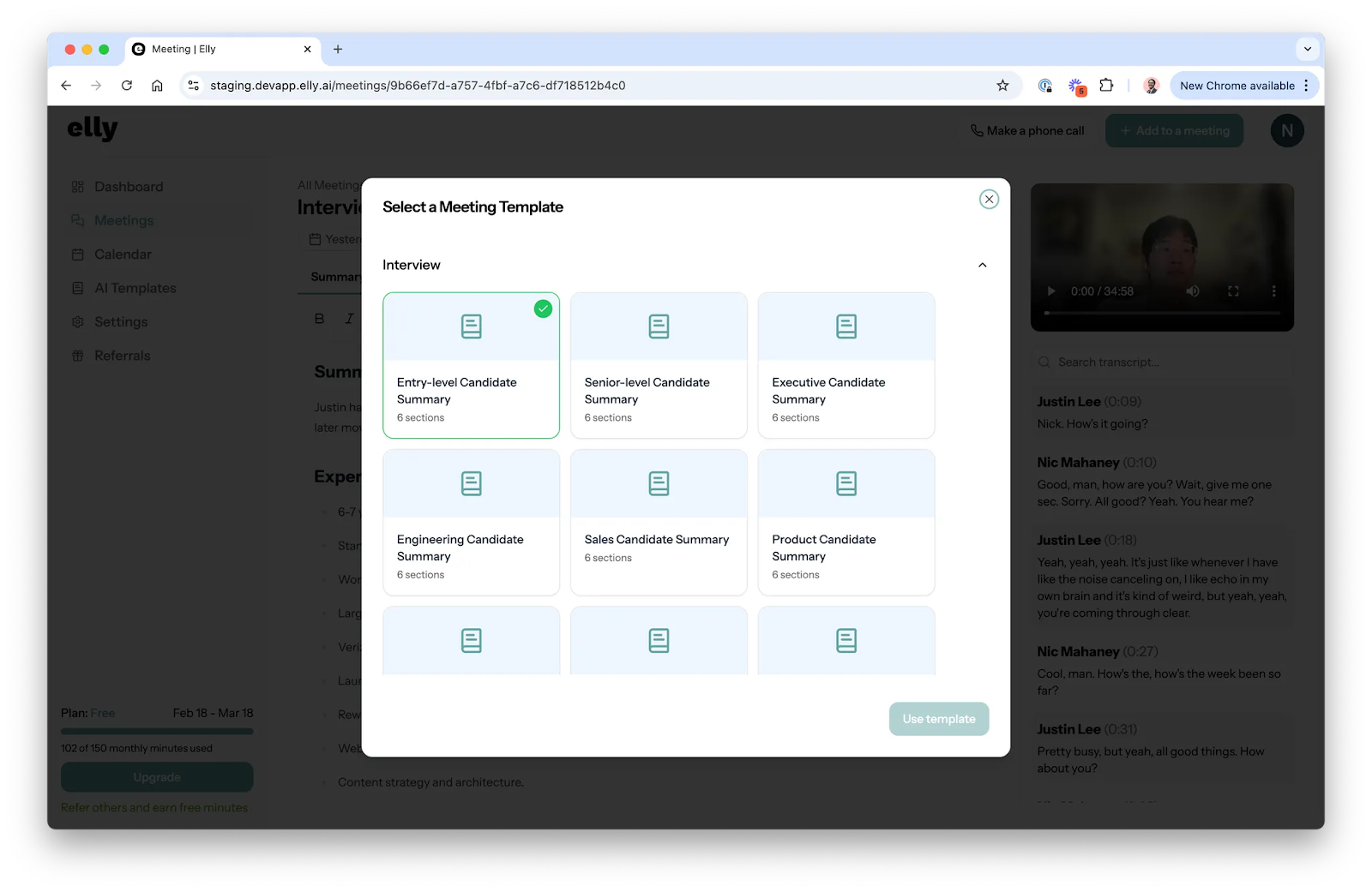 - Selecting a "Generic Entry-Level Candidate Summary" template will reprocess the meeting and generate a new output in under a minute.