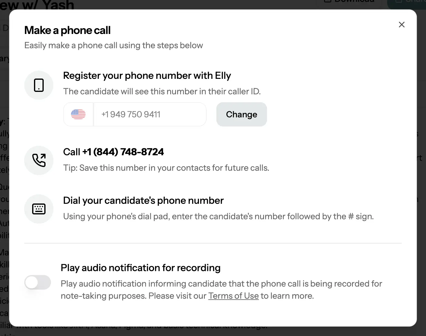 Sometimes, you want to place a phone call without an automated message. By clicking “Make a phone call” in Elly, you can disable the usual recording prompt. But remember—always inform call participants that the call is being recorded, so everyone’s on the same page.