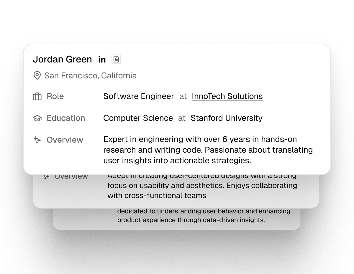 Type a simple prompt or an elegant query and Elly instantly searches millions of profiles to surface the best matches across our proprietary data sources.
